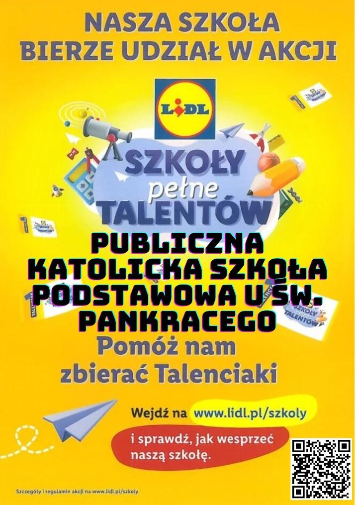 Nasza szkoła przyłączyła się do akcji LIDL Polska "Szkoły pełne talentów". Akcja trwa do 13 listopada 2022 roku. Do tego czasu można zbierać i przekazywać wybranej szkole talenciaki. Kupony odbieramy za zakupy w sieci sklepów LIDL (za każde wydane 50 zł - w tym 1 warzywo lub owoc - otrzymujemy 1 talenciak). Zachęcamy do wspierania PUBLICZNEJ KATOLICKIEJ SZKOŁY PODSTAWOWEJ U ŚW. PANKRACEGO W JELENIEJ GÓRZE!