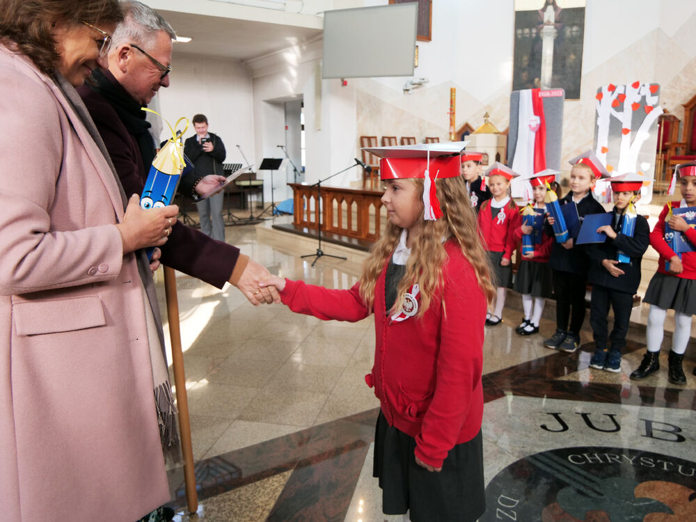 Klasa druga, pełna entuzjazmu, przeprowadziła "egzamin" dla pierwszoklasistów, opierając się na tekście Władysława Bełzy "Katechizm polskiego dziecka". To było nie tylko wyzwanie intelektualne, ale również okazja do zacieśnienia więzi między klasami. Następnie obie klasy, z wielkim zaangażowaniem, zaśpiewały hymn szkoły - "Króluj nam Chryste". To wzruszające i jednoczące chwile, które z pewnością na długo pozostaną w pamięci naszych uczniów.