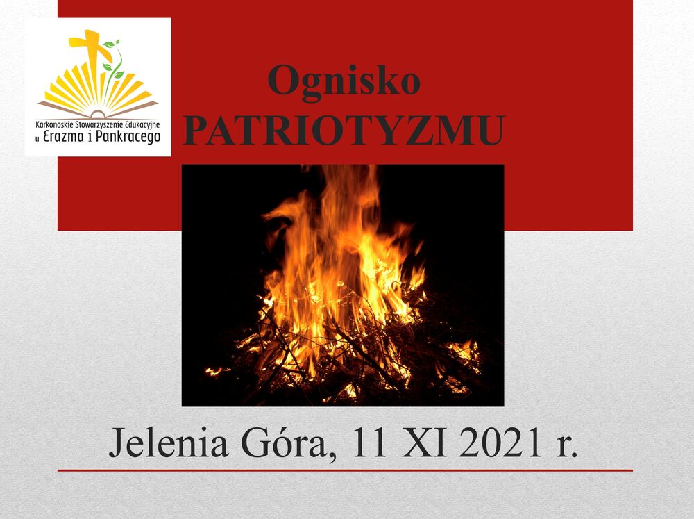 Wspólny śpiew pieśni patriotycznych rozpoczniemy przy żywym ogniu w czwartek 11 listopada o godz. 18:30. Tradycyjnie, a jest to już X nasze ognisko, zawiążemy braterską wspólnotę na dziedzińcu dawnego Kolegium Jezuickiego przy ul. M. Kopernika 1. Jest to budynek, w którym mieści się Zespół Szkół Katolickich u św. Pankracego w Jeleniej Górze.
