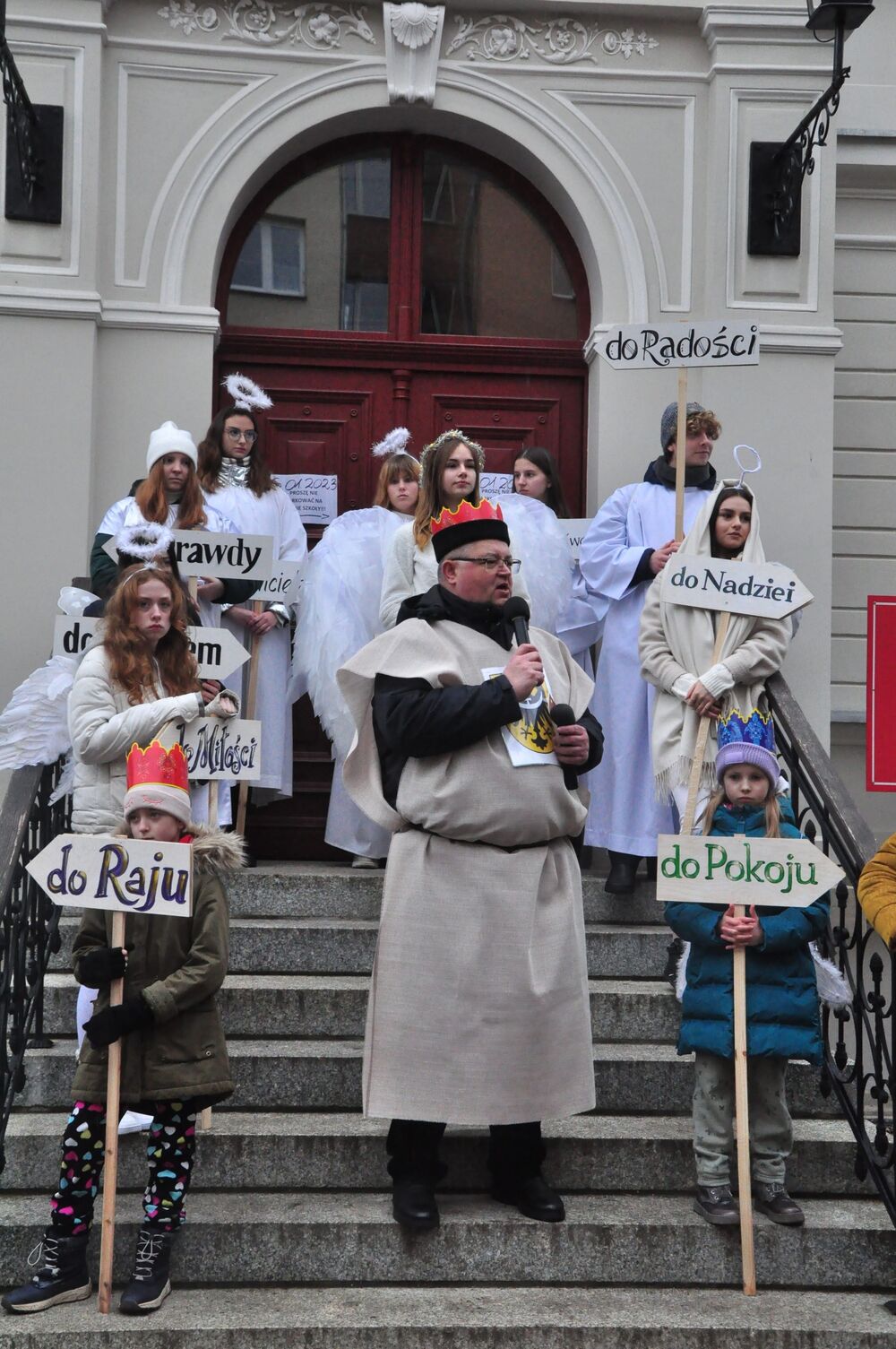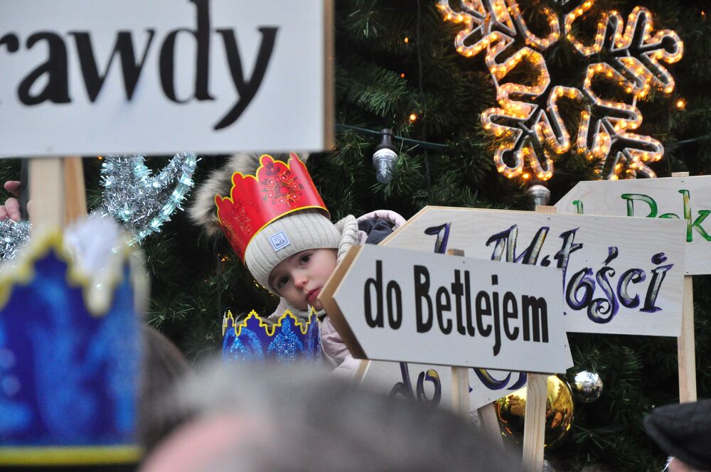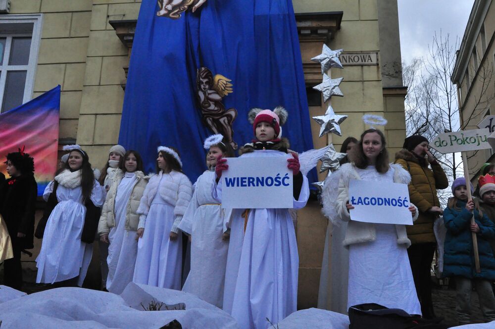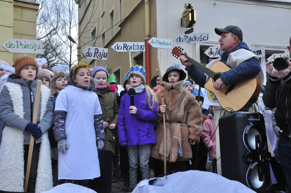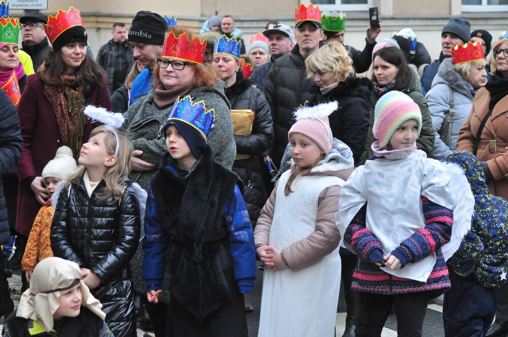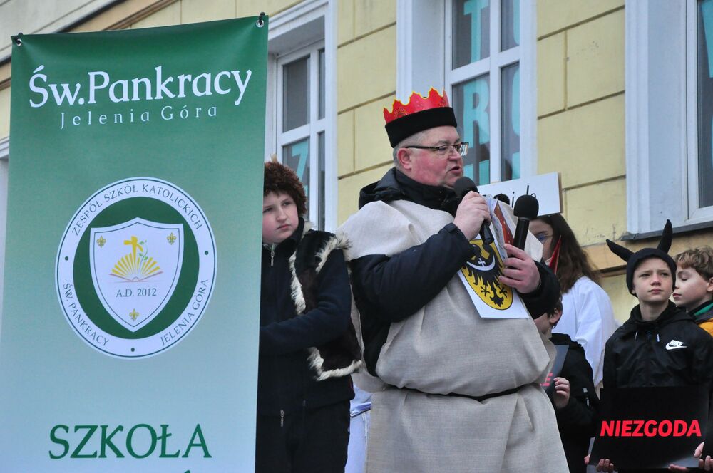 Jak co roku 6 stycznia podążamy za gwiazdą betlejemską w uroczystym orszaku. To już 12 raz, kiedy manifestujemy swoją wiarę i wspólnie kolędujemy oddając cześć nowonarodzonemu Jezusowi. Po Mszy Świętej o godz. 12 wyruszliśmy spod Bazyliki św. Erazma i Pankracego za specjalną karocą, na której podróżowali trzej królowie. Ci mędrcy, ubrani w trzy kolory symbolizują wszystkich ludzi z danego kontynentu, którzy jeszcze jako poganie idą oddać pokłon Jezusowi, a co za tym idzie doświadczyć Zbawienia i mieć w nim swój udział. Kolor czerwony - Król Kacper - symbolizuje Europę, kolor niebieski - Król Baltazar - sybolizuje Afrykę, a kolor zielony - Król Melchior - symbolizuje Azję. Podróżowaliśmy przez całe centrum miasta radośnie kolędując i niosąc radość. Zatrzymywaliśmy się przy 5 stacjach - najpierw przy budynku jeleniogórskiego Ratusza wysłuchaliśmy występu przedszkolaków, następnie obejrzeliśmy występ klasy VIII z naszej szkoły, później obejrzeliśmy krótką scenkę "w domu Heroda" przygotowaną przez uczniów klasy V i VI naszej szkoły wraz z gościnnym występem wszystkich naszych klas w pastorałce "Świeć gwiazdeczko świeć", a na koniec obejrzeliśmy kolejną scenkę przy pomniku upamiętniającym 900-lecie Jeleniej Góry. Finalnie dotarliśmy do sceny głównej, na której czekała już tegoroczna święta rodzina! W tym roku tę rolę odegrali państwo Klaudia i Grzegorz Czerwcowie wraz ze swoimi dziećmi - Anią i Janem, który dumnie odgrywał rolę Jezusa. Pani Klaudia jest nauczycielką w naszej szkole podstawowej przez co jej rola była dla nas bardzo ważna i była wielkim powodem do dumy!