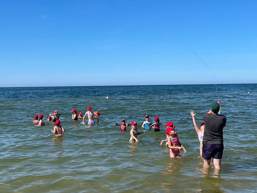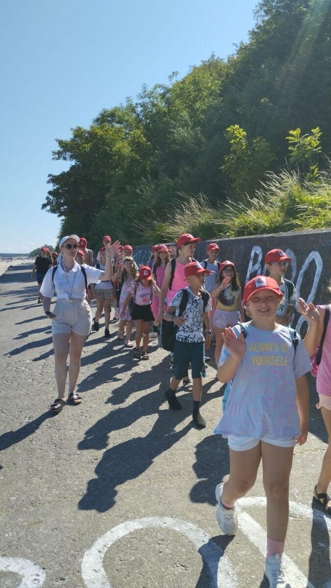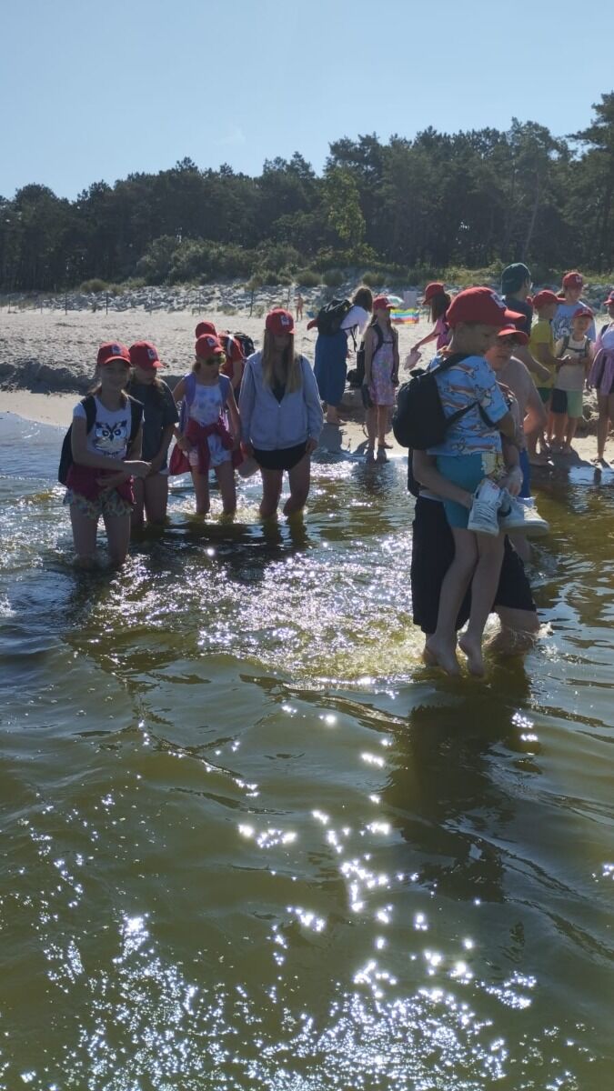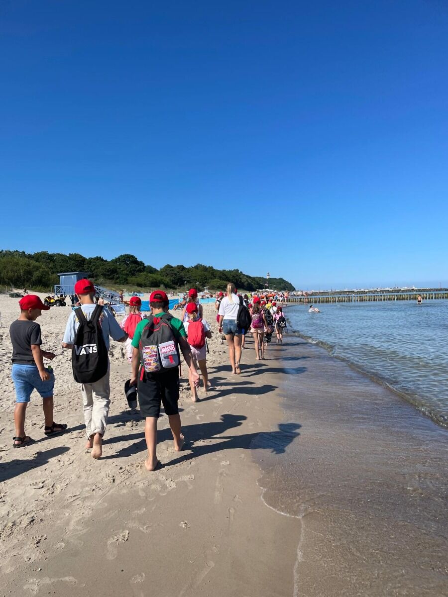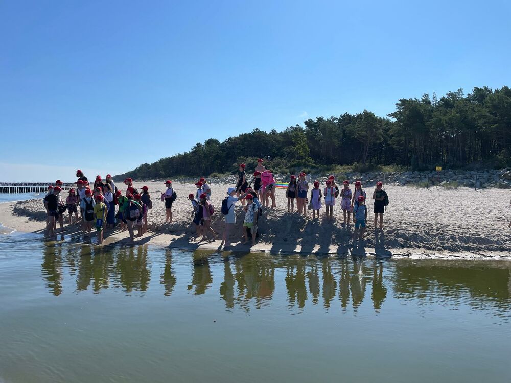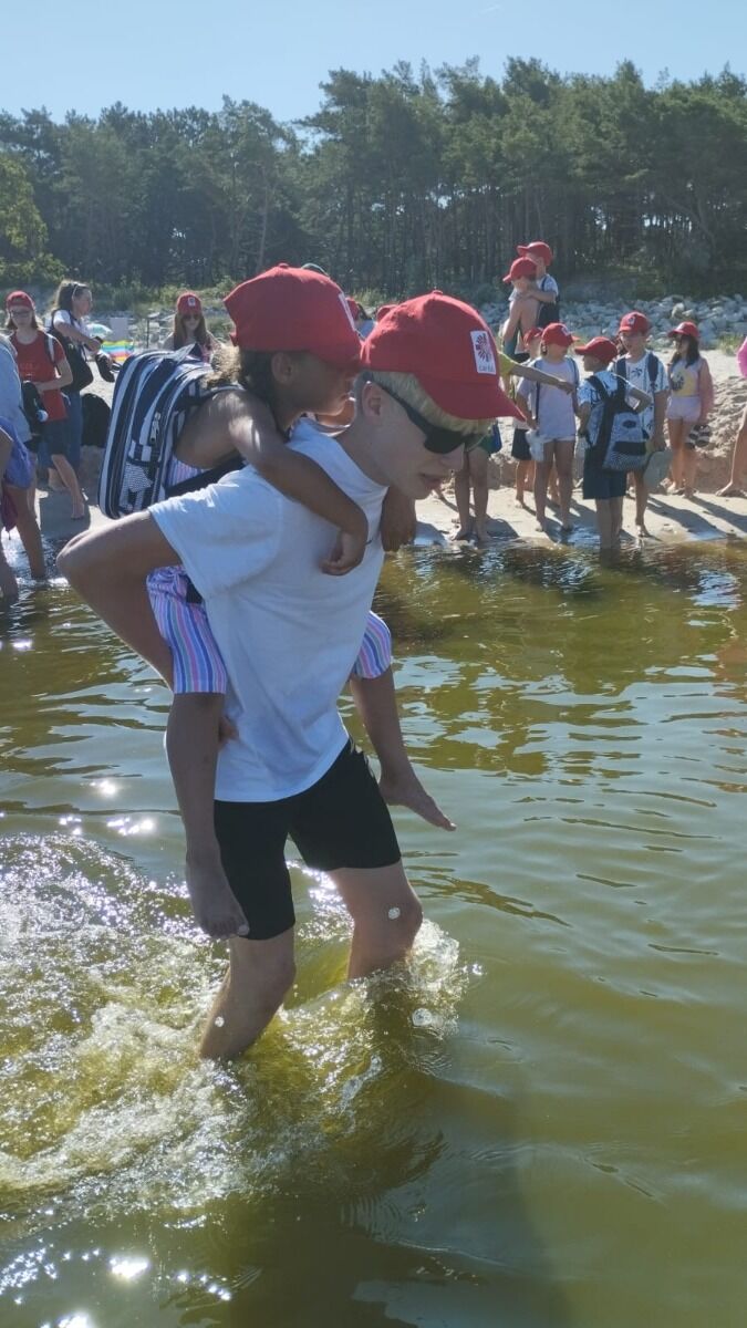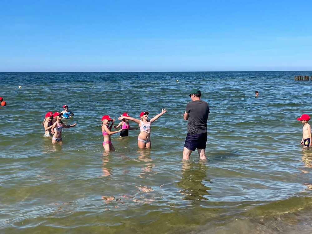 Pogoda nam dopisywała cały dzień. Rano, wyjątkowo, nie zaczynaliśmy od rozgrzewki, bo od razu po śniadaniu udaliśmy się na spacer - 4 km brzegiem Morza. Naszym celem była motylarnia w Niechorzu, ale na naszej drodze natrafiliśmy na przeszkodę. Rzeczka, którą wcześniej pokonywaliśmy bezproblemowo, wezbrała tak, że nasi najwyżsi uczestnicy musieli pomagać najmniejszym w przeprawie. Ta wyjątkowa przygoda jeszcze ściślej zintegrowała naszą grupę i pokazała nam, że dla naszej ekipy nie ma przeszkód, których nie moglibyśmy pokonać. Po motylarnii mieliśmy chwilę na zakupy pamiątek oraz na lody. Po powrocie obiad i cisza poobiednia. Popołudniu już tylko relaks na plaży. Graliśmy w piłkę, pływaliśmy w Morzu, graliśmy w gry karciane, czytliśmy książki, puszczaliśmy latawce - po prostu świetnie spędzaliśmy czas. Po kolacji było ognisko, przy którym śpiewaliśmy z towarzyszeniem gitary najlepsze hity. Piekliśmy też kiełbaski. Po jedzeniu odbył się jeszcze I Kolonijny Turniej Karaoke. Później to już tylko kąpiel i spanko. Dobrego dnia wszystkim!