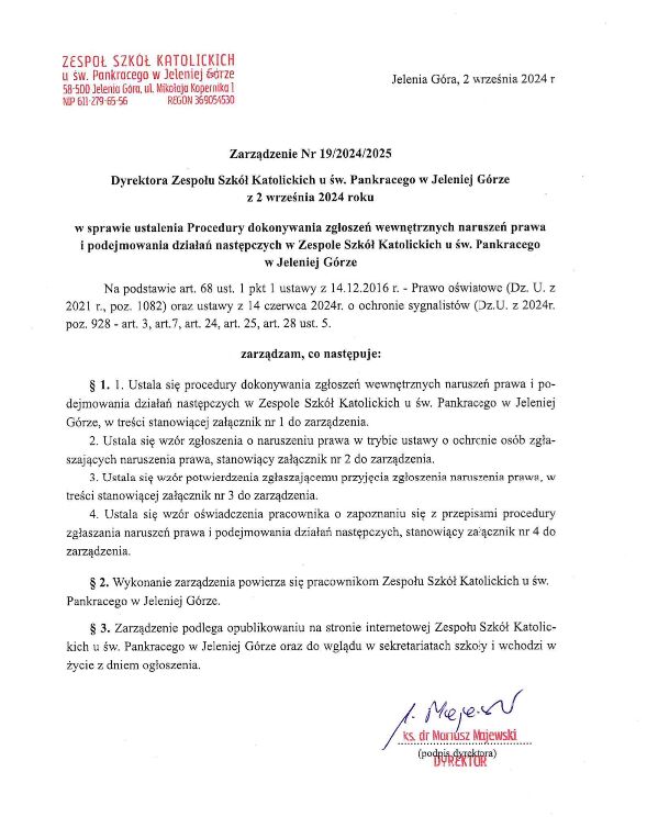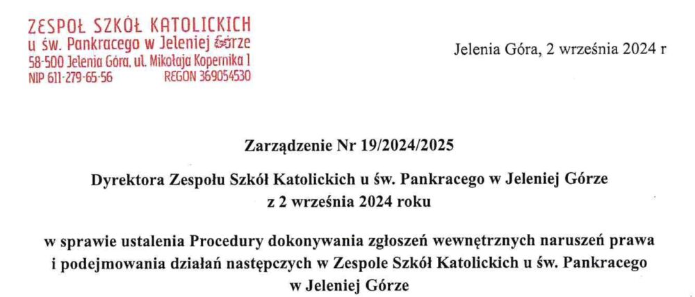 Zarządzenie Nr 19/2024/2025 Dyrektora Zespołu Szkół Katolickich u św. Pankracego w Jeleniej Górze z 2 września 2024 roku w sprawie ustalenia Procedury dokonywania zgłoszeń wewnętrznych naruszeń prawa i podejmowania działań następczych w Zespole Szkół Katolickich u św. Pankracego w Jeleniej Górze.
