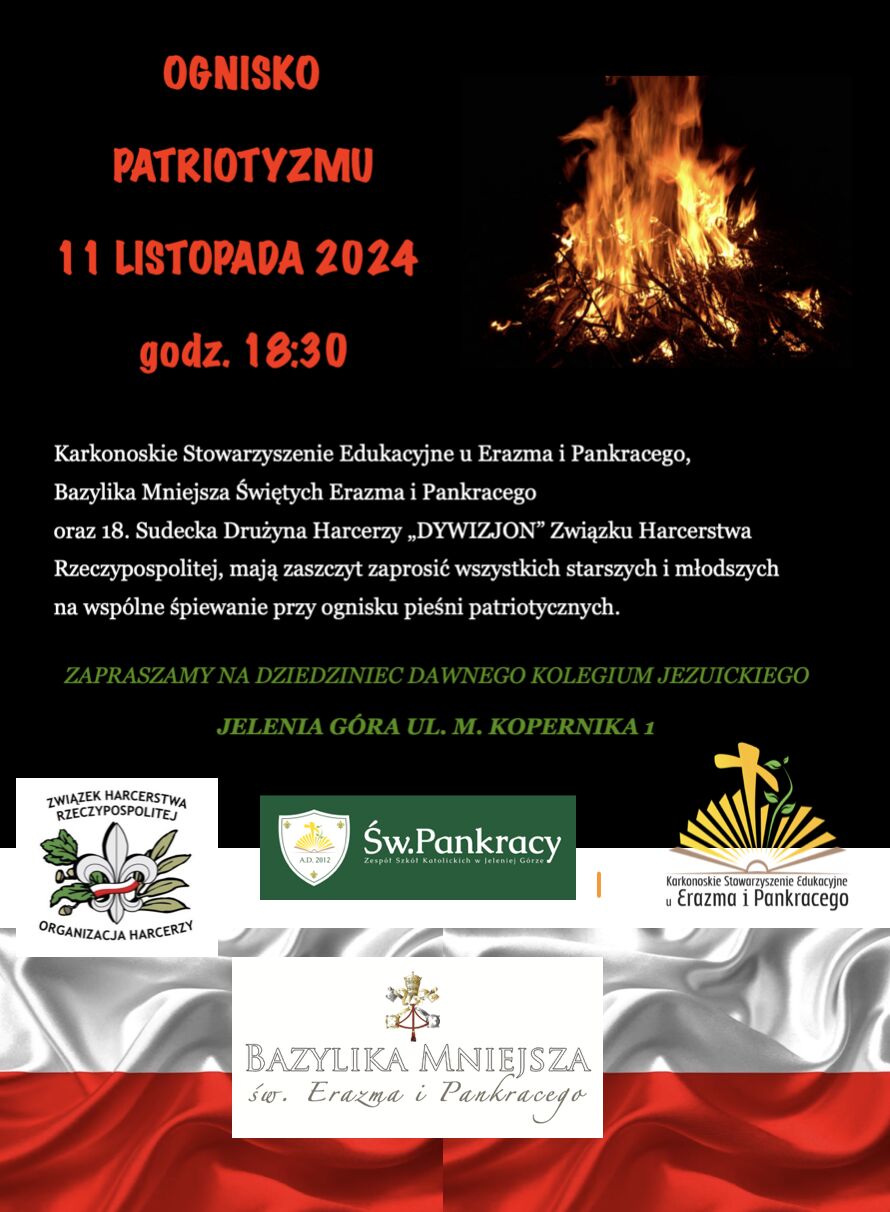 Z okazji zbliżającego się święta państwowego 11 XI - Narodowego Święta Niepodległości, Karkonoskie Stowarzyszenie Edukacyjne u Erazma i Pankracego już po raz 11. organizuje „Ognisko Patriotyzmu”. Zapraszamy do budowania Wspólnoty Narodowej, do śpiewu pieśni patriotycznych. Czynimy tak od roku 2011 siadając w kręgu wokół ogniska na dziedzińcu przy budynku naszej Szkoły. Zaczynamy o 18:30!