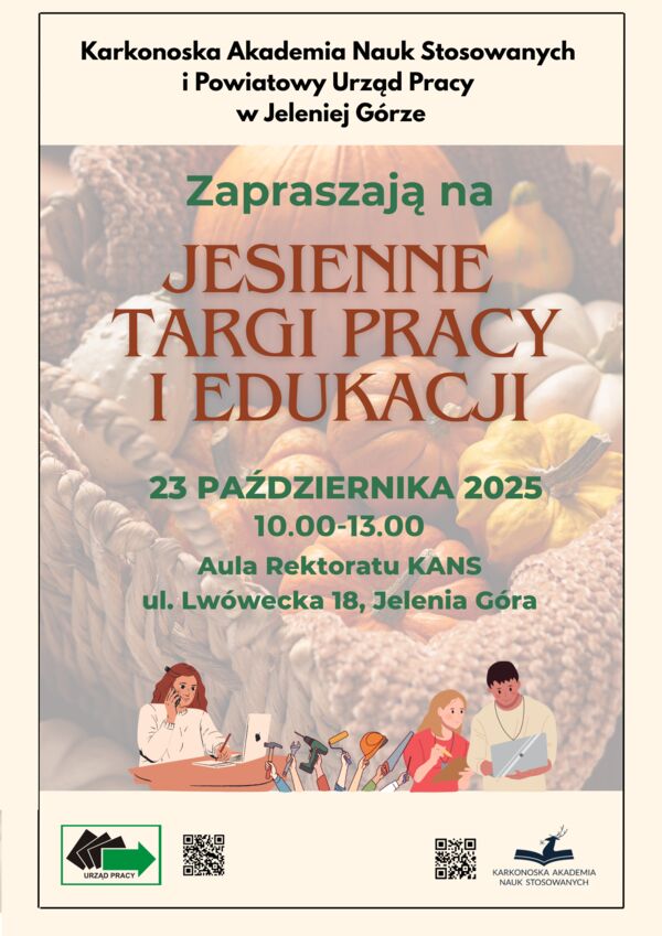 W czwartek, 23 października 2025 r., uczniowie naszego Liceum wezmą udział w Jesiennych Targach Edukacji i Pracy, które odbędą się w auli rektoratu Karkonoskiej Akademii Nauk Stosowanych w Jeleniej Górze. Organizatorem wydarzenia jest Karkonoska Akademia Nauk Stosowanych we współpracy z Powiatowym Urzędem Pracy w Jeleniej Górze.