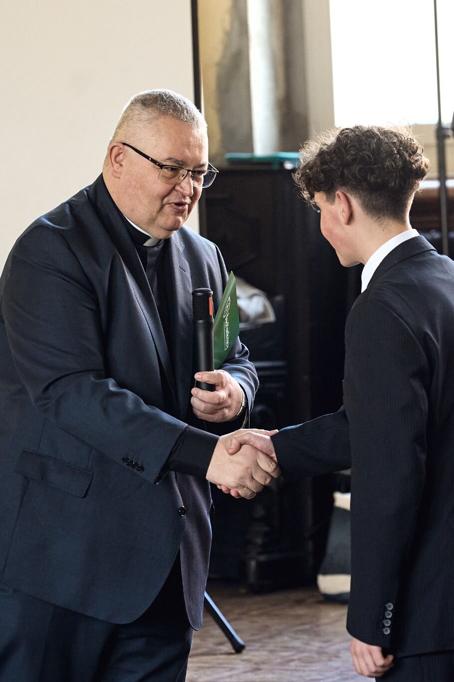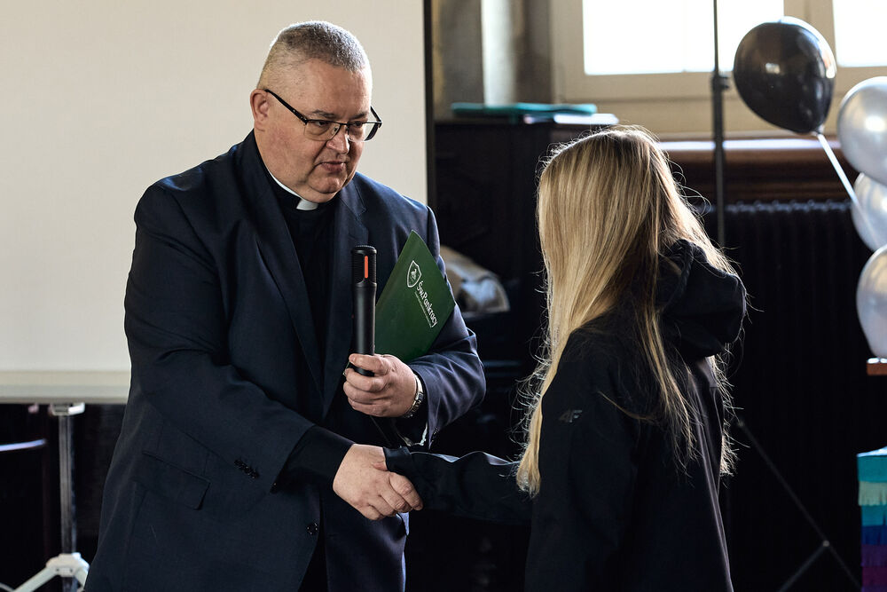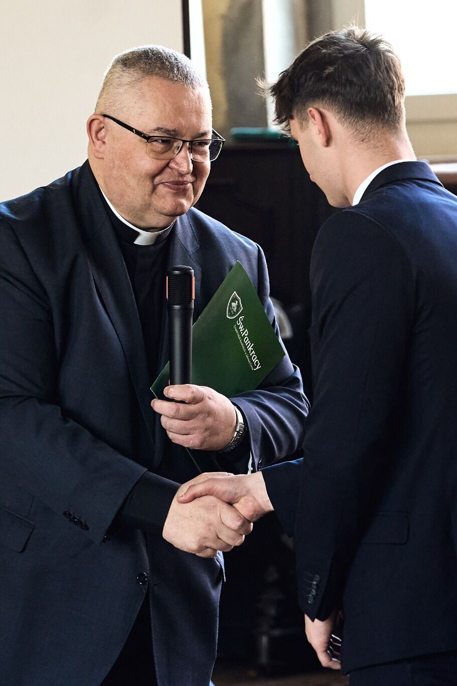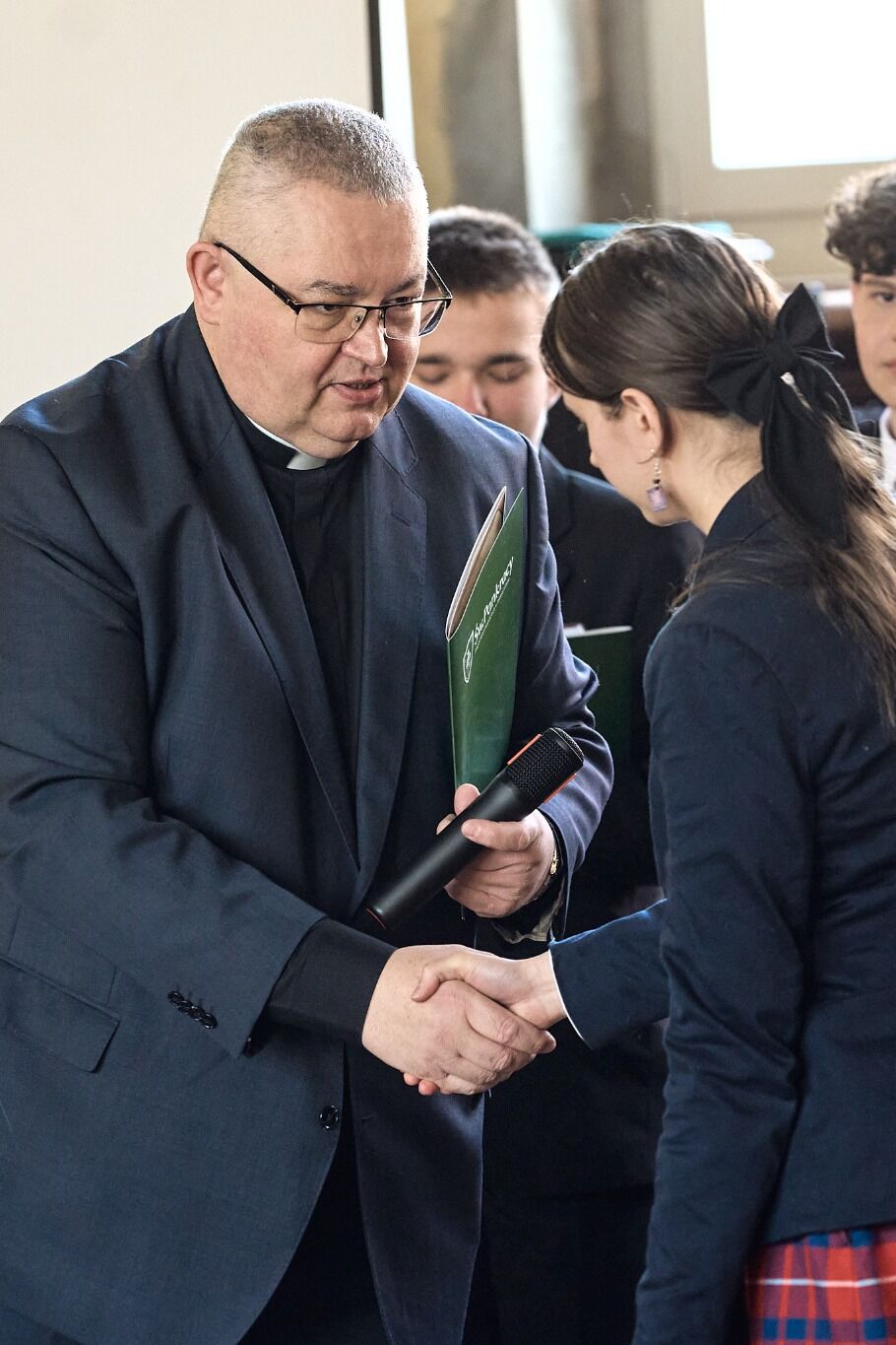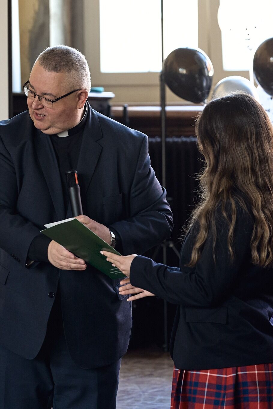 Do abiturientów zwrócił się Ksiądz Dyrektor dr Mariusz Majewski, gratulując im dojrzałości i życząc odwagi w dorosłym życiu. Nie zabrakło też akcentu humorystycznego – klasa 3As wystąpiła z piosenką oraz zabawnym „spojrzeniem z boku” na swoich starszych kolegów, co było świetnym dopełnieniem uroczystości.