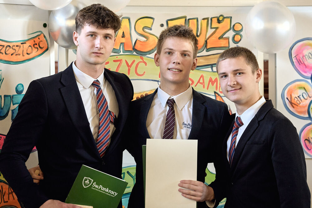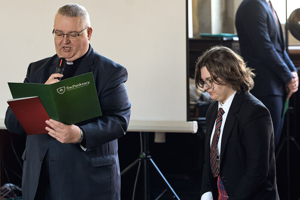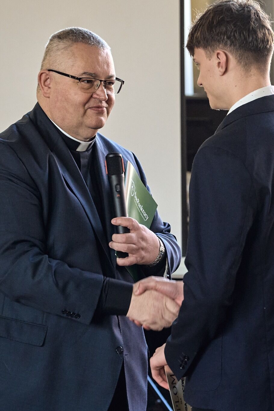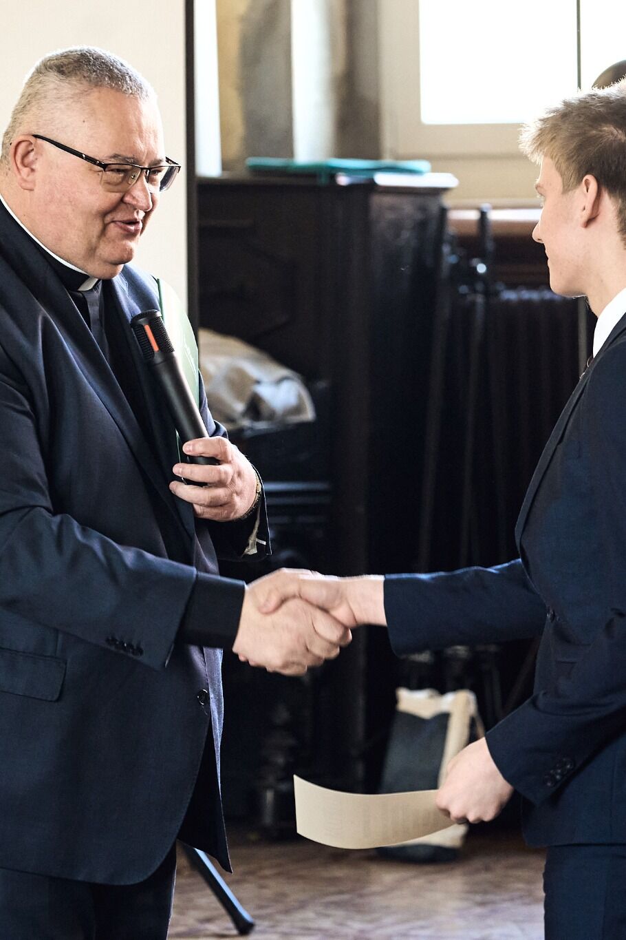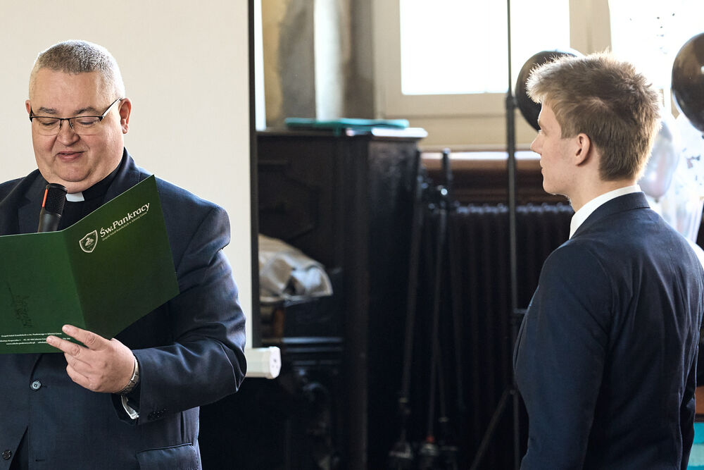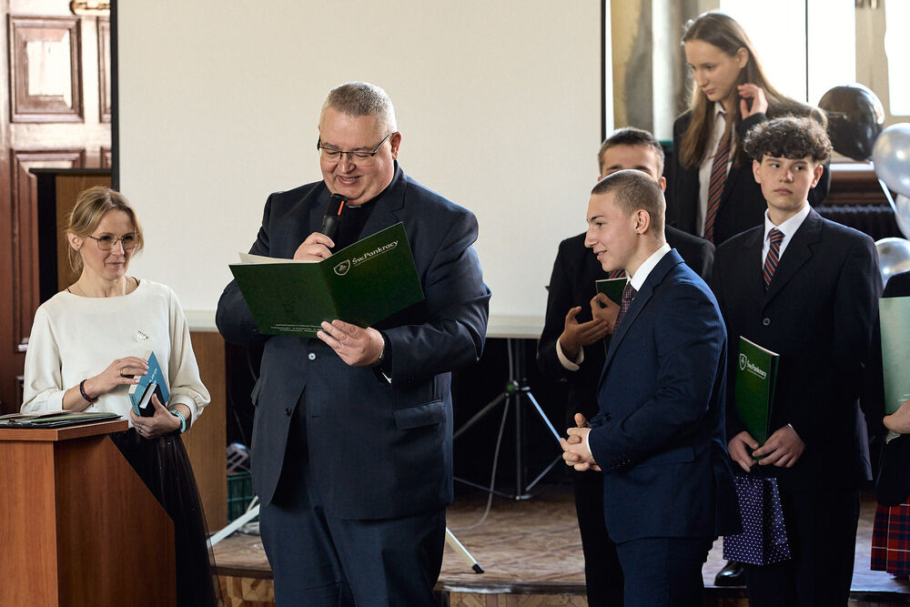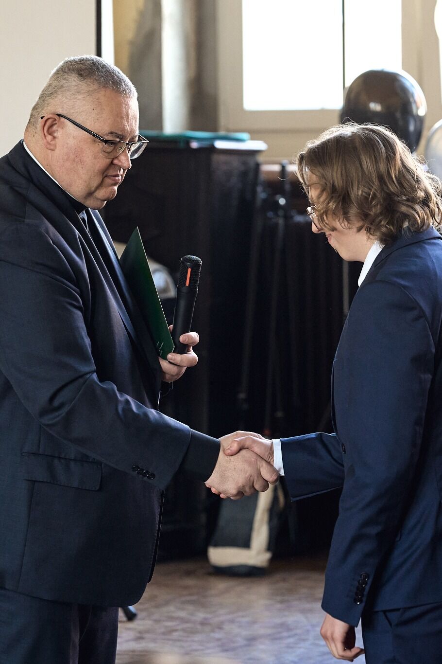 Do abiturientów zwrócił się Ksiądz Dyrektor dr Mariusz Majewski, gratulując im dojrzałości i życząc odwagi w dorosłym życiu. Nie zabrakło też akcentu humorystycznego – klasa 3As wystąpiła z piosenką oraz zabawnym „spojrzeniem z boku” na swoich starszych kolegów, co było świetnym dopełnieniem uroczystości.