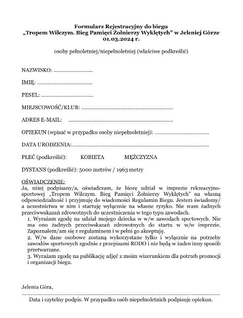 3. Osoby niepełnoletnie biorą udział w Biegu pod warunkiem podpisania zgody na start i wzięcia odpowiedzialności przez ich prawnych opiekunów. Każda osoba niepełnoletnia musi posiadać zgodę rodziców / opiekunów prawnych / na udział