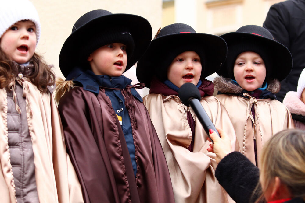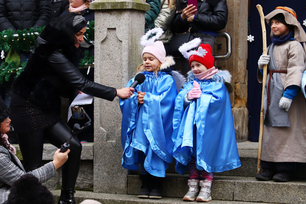 Gwiazda niesiona przez przedstawiciela Domowego Kościoła zaprowadziła nas do celu marszu, którym było spotkanie ze Świętą Rodziną – w tym roku z państwem Natalią i Patrykiem wraz ze swoim synem Ignacym. Kolorowy korowód pokłonił się Dzieciąteczku, a Mędrcy złożyli tradycyjne dary: złoto, kadzidło i mirrę. Przybyłych powitał prezydent Miasta Jeleniej Góry, pan Jerzy Łużniak. Radość trwała, wyśpiewaliśmy wszystkie kolędy, w czym pomogli nam duzi i mali Skauci Europy. A dobrze słychać było dzięki Krzysztofowi Kamińskiemu.