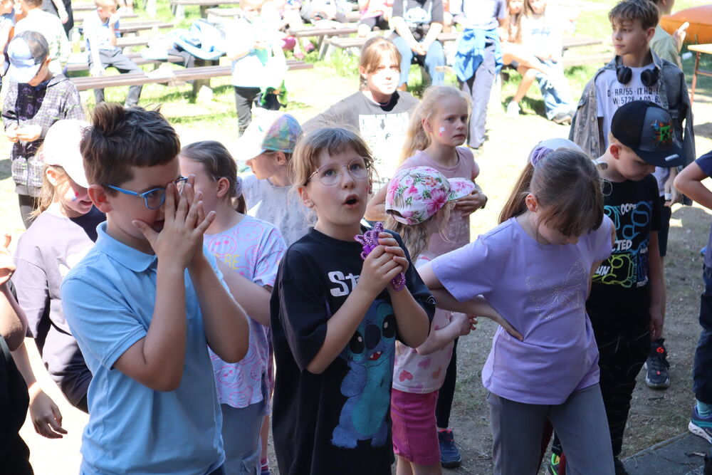 Po emocjonujących zawodach przyszedł czas na rozrywkę w formie różnorodnych gier i zabaw. Jedną z najbardziej ekscytujących było "Jaka to piosenka", inspirowane popularnym teleturniejem. Uczniowie musieli wykazać się znajomością różnorodnych melodii i tekstów, co przynosiło wiele śmiechu i radości. Niezwykle kreatywną grą była również "możliwości", podczas której grupy dzieci musiały wymyślić jak najwięcej zastosowań dla przedmiotów codziennego użytku. To zadanie wymagało od uczestników elastyczności myślenia i pomysłowości, co sprawiło, że wszyscy świetnie się bawili.